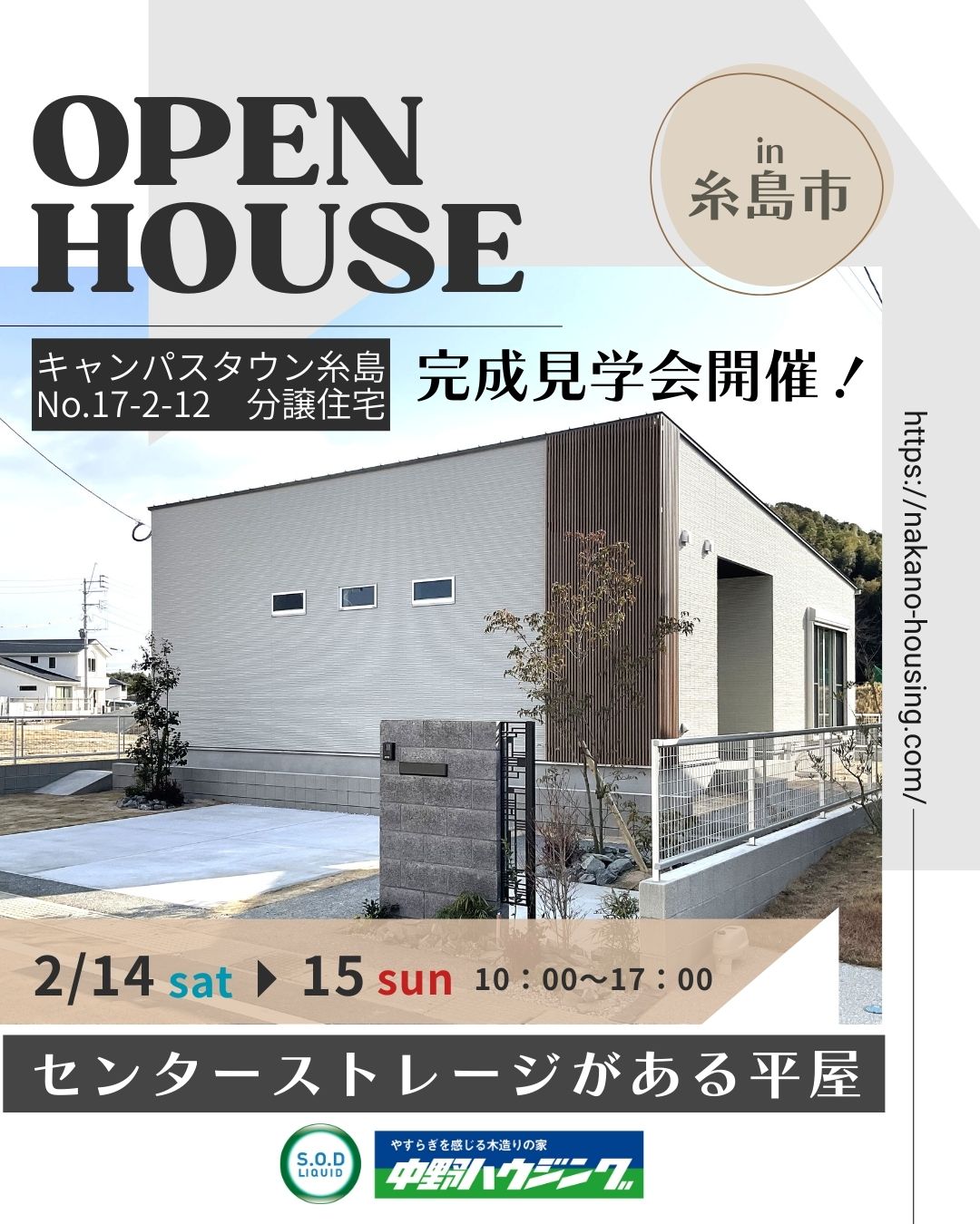 2026/02/02Blog2/14(土)・15(日)【福岡】糸島の平屋 完成見学会開催!#ZEH・ZEH水準#制震装置 MIRAIE#S.O.Dリキッド#中野ハウジングの家づくり#福岡#OPEN HOUSE -