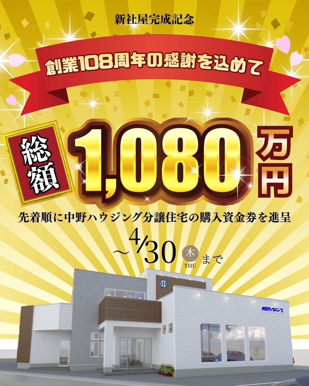 創業108周年の感謝を込めて総額1,080万円!分譲住宅購入資金券プレゼント♪<延長します!>