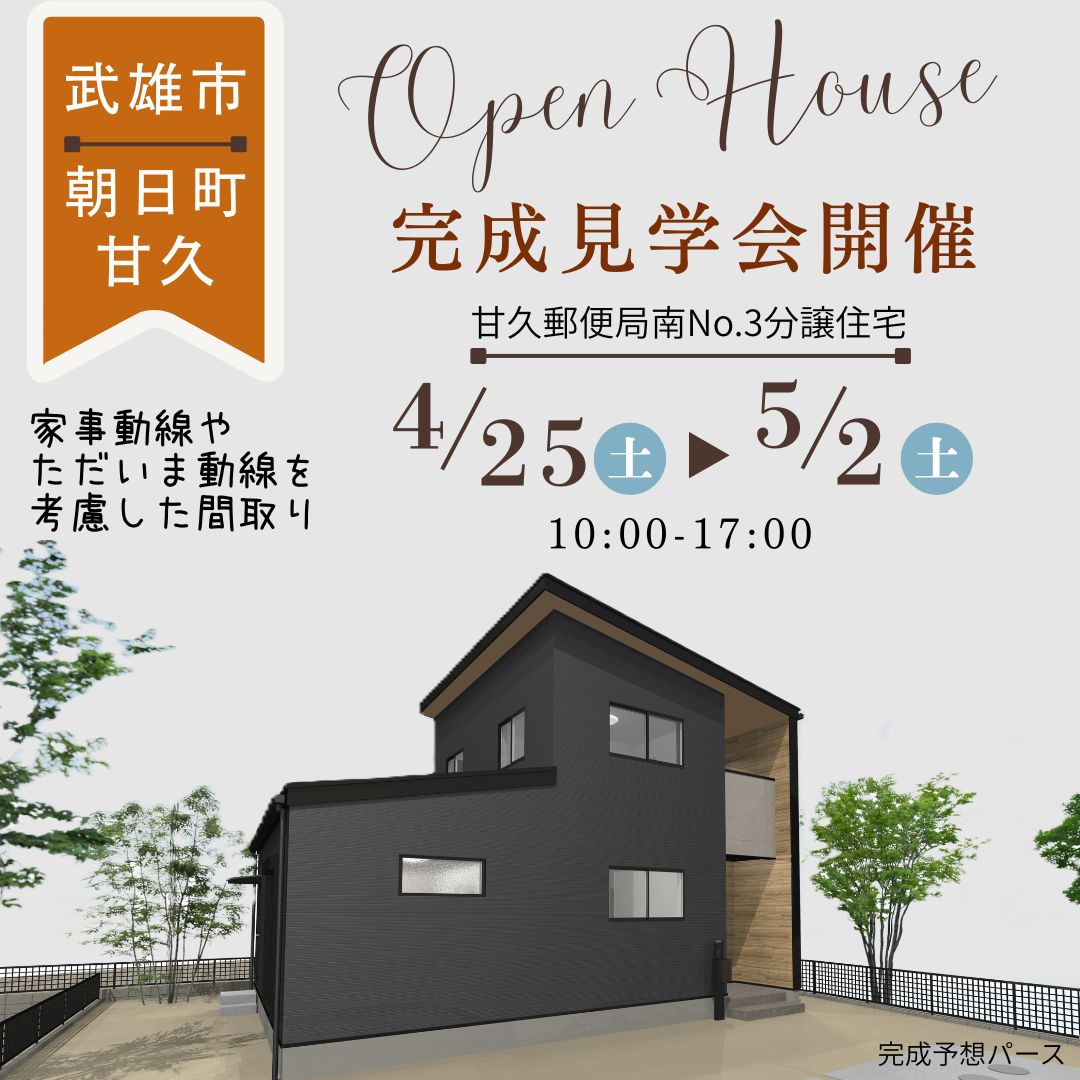 2026/04/10Blog4/25(土)~5/2(土)【武雄】完成見学会開催!#ZEH・ZEH水準#制震装置 MIRAIE#お知らせ#S.O.Dリキッド#中野ハウジングの家づくり#武雄#OPEN HOUSE -