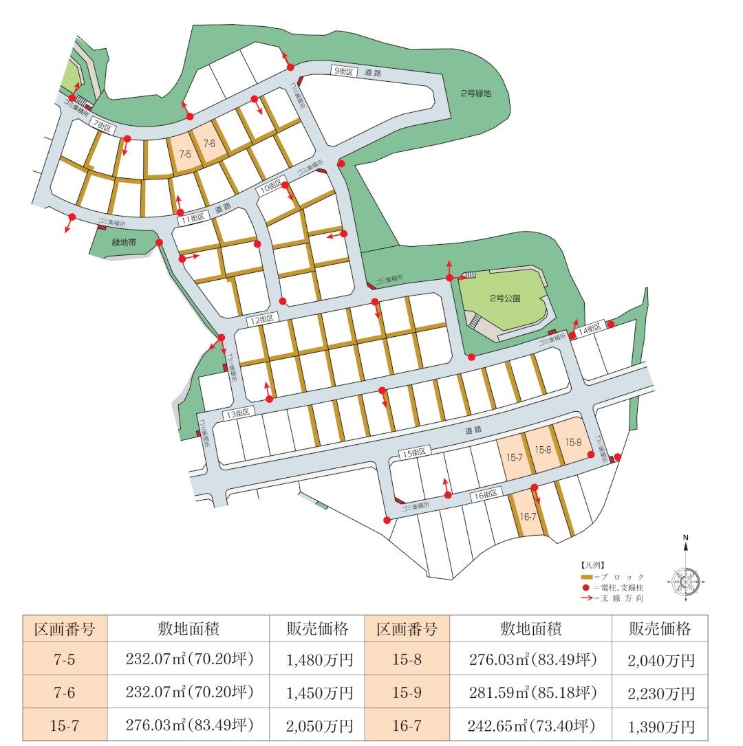 - 開発道路(アスファルト舗装、私道負担無し)幅員:6m・9m・14m、市道10m